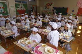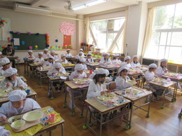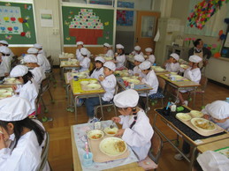 入学式から1週間後の4月14日( 月)より、小学校生活での給食スタートしました。 初めての給食に、最初は6年生のお兄さんお姉さんや先生に優しく手伝ってもらいながら準備をする1年生の姿がありました。ちょっぴり緊張しながらも、配膳されたお盆を運ぶ表情の奥には、早く美味しい給食を食べたいという期待感が感じられました。「いただきま~す!」の元気な挨拶とともに、みんな満面の笑顔で給食を頬張っていました。