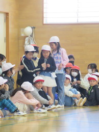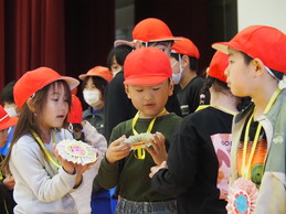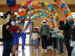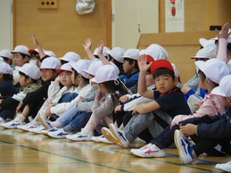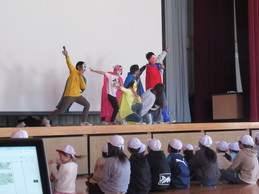 初めて全校児童と顔を合わせる1年生が、6年生と手をつないで入場するところから始まりました。会の最初に、緊張しながらも、1年生一人ひとりが自分の言葉で自己紹介をする姿は、2~6年生にとってとても素敵な印象を与えました。途中、飯野レンジャーが登場すると、会場は大盛り上がり!1年生は目を輝かせて見入っていました。飯野レンジャーとの約束を守り、素敵な“飯野っ子”になってくれることでしょう。この会を通して、254名の児童全員が温かい気持ちで一つになることができました。