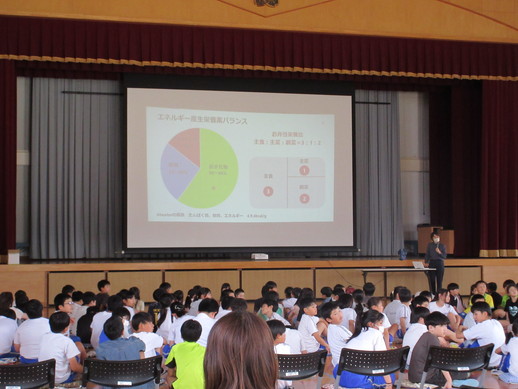 鈴木先生は、子どもたちと対話しながら朝食の重要性や熱中症対策について、大変分かりやすく説明してくださいました。講演後、6年生からは「今日から栄養を意識してご飯を食べたい」という感想も聞かれ、子どもたちも自分の健康を守るためにどんなことをしていけばよいか学ぶことができました。