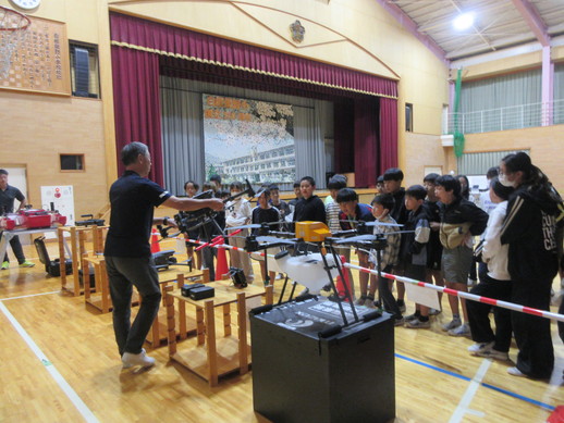 私たちの身の回りの様々な場所で活躍しているドローン。児童たちは、そのドローンを間近に見学し、大変興味深く講師のお話に聞き入っていました。