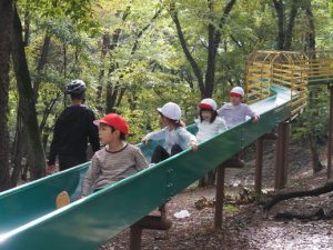 10月15日(水)、秋晴れの暖かい日差しに恵まれ、1年生が金川の森へ遠足に出かけました。