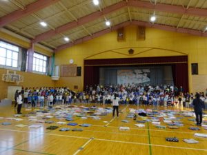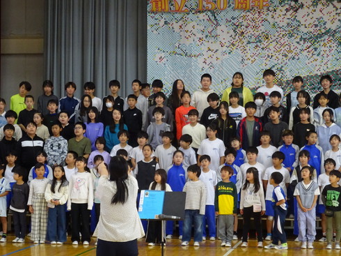 今年の全校合唱曲は「風になりたい」です。朝の会や音楽の時間に、各クラス・各学年で日々練習を積み重ねてきました。今日は、初めて全校で合わせて歌いました。「低学年の元気あふれるソプラノ」「高学年の深みのあるきれいなアルト」 これらの声が一つとなり、大変素晴らしいハーモニーを奏で、全校で心を合わせ、歌声を作り上げています。