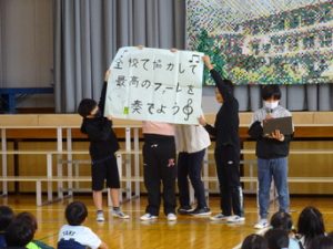 10月下旬に入ると、本格的に児童発表会の練習が始まりました。発表会のテーマである「全校で協力して、最高のファーレを届けよう」のもと、本番に向けて全校児童が一体となって練習に励んでいます。本日、児童発表会で発表する全校合唱の練習が行われました。