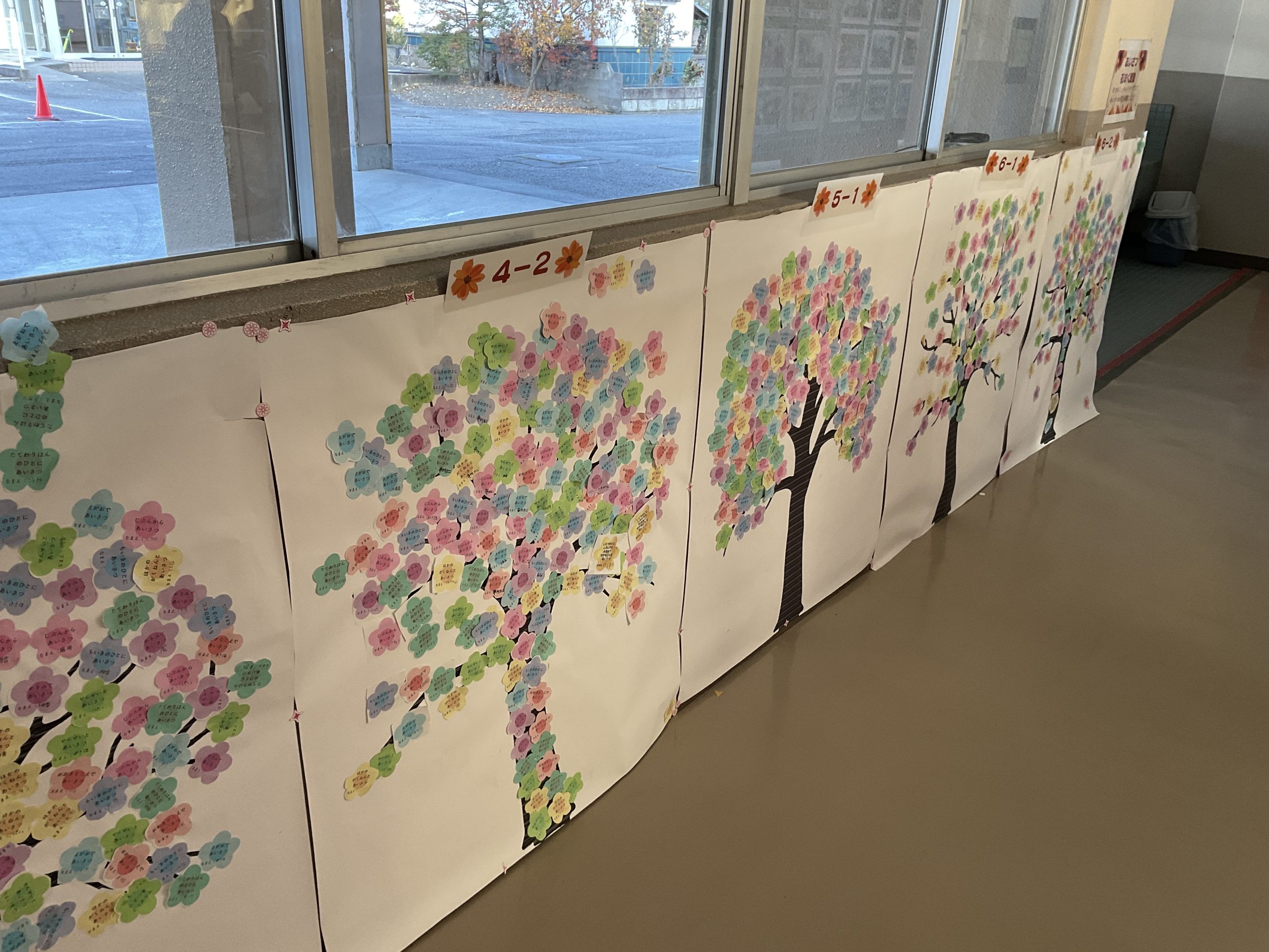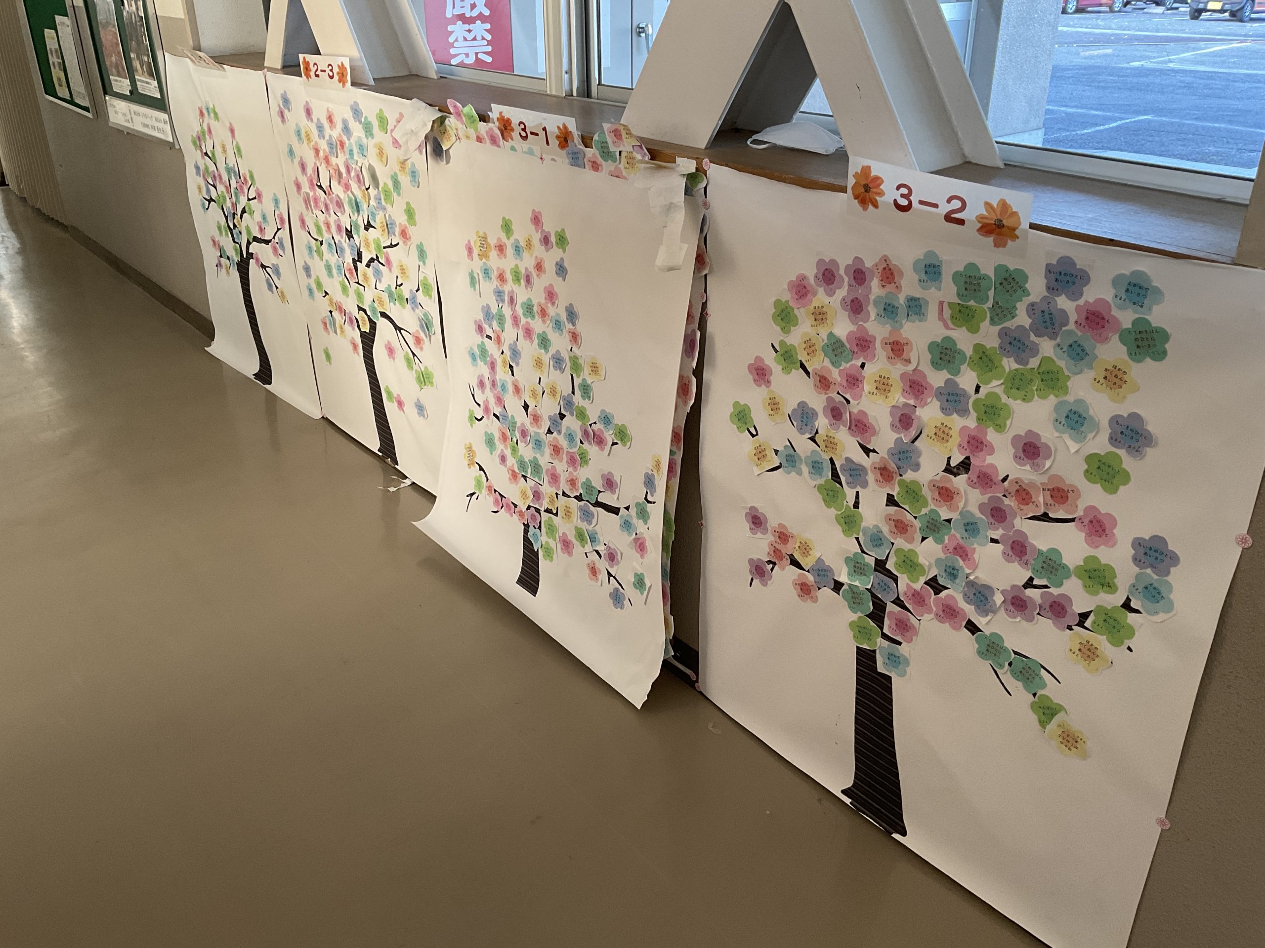 運動のシンボルは、職員室前の廊下に貼られている「あいさつの木」です。児童会が設定したあいさつミッションをクリアすると、花びらの紙に名前を書いて、「あいさつの木」に貼ることができます。