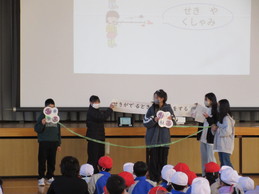 集会では、冬場に流行しやすい感染症について、保健委員の児童が劇やクイズを交えて分かりやすく解説してくれました。「どうすればウイルスから体を守ることができるのか」という難しいテーマも、劇を通じることで全校児童が楽しみながら学ぶことができました。